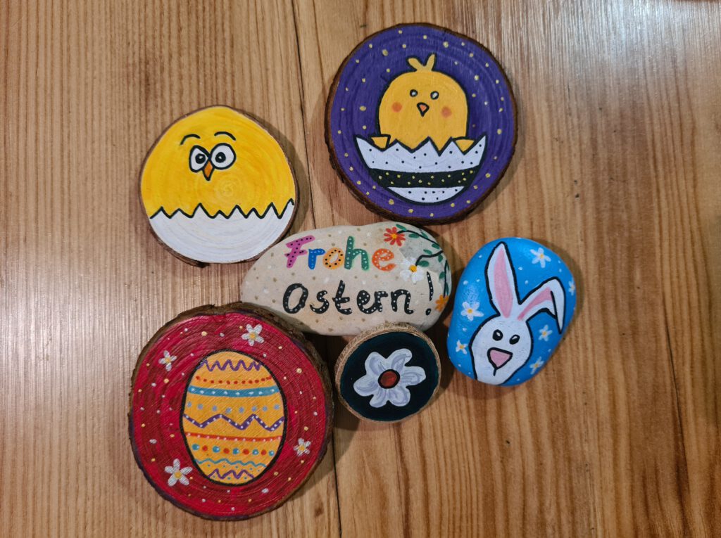 Kreative Ostermalereien auf Holzscheiben und Steinen