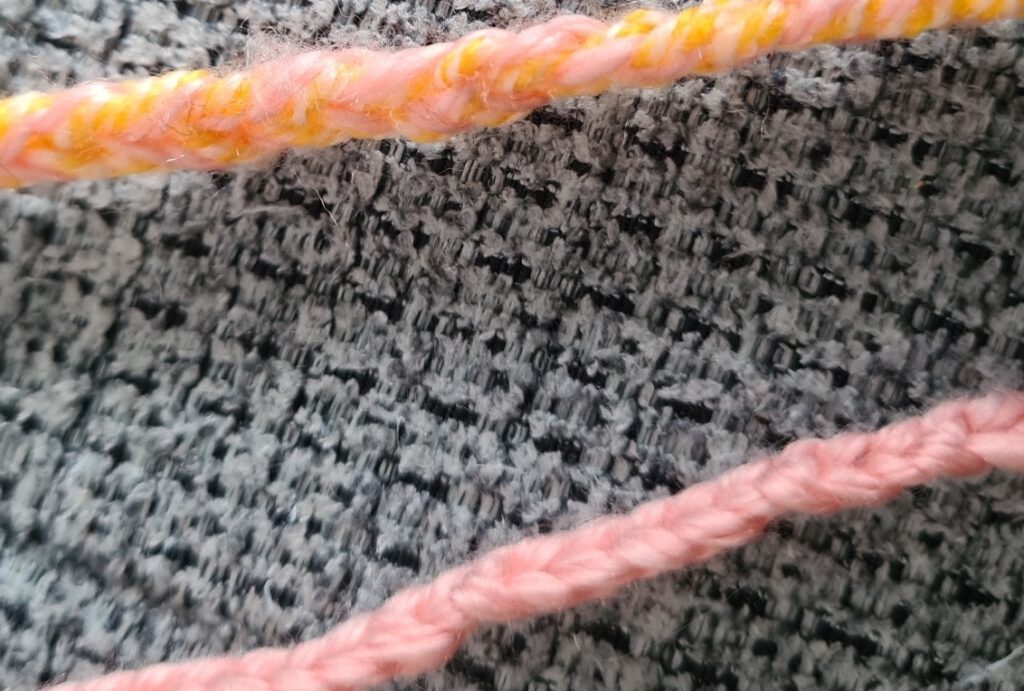 Sobald die Farbe gut getrocknet ist, geht es an die Wollzöpfe. Dafür nimmst du mehrere Wollfäden in bunten Farben und flechtest daraus Zöpfe. Diese werden an der Unterseite der Pappe befestigt. Ich habe hierzu einfach mit einem Locher ein paar Löcher an der unteren Kante gemacht und die Wollzöpfe durchgefädelt.